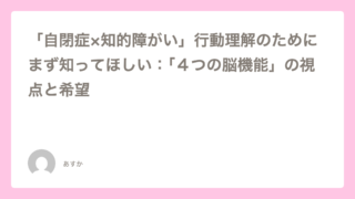 でも安心してください。これは私たちの育て方のせいではありません。お子さまの行動は、看板記事(「自閉症×知的障がい」行動理解のためにまず知ってほしい:「4つの脳機能」の視点と希望